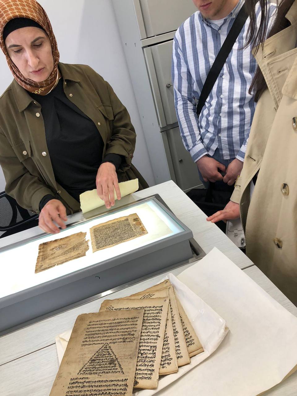 Далее зав. ФВР М.Г. Шехмагомедов дал характеристику Фонду восточных рукописей ИИАЭ, показав наиболее ценные экземпляры печатных и рукописных трудов. Реставратор А.Д. Галбацева познакомила будущих исследователей-историков с интересной и кропотливой работой по оцифровке, восстановлению рукописей, их обеззараживанию и созданию бумаги.