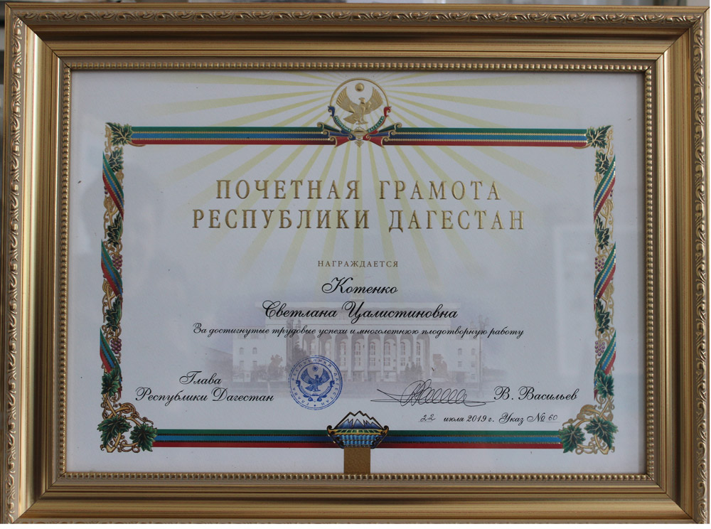 Ранее Котенко С.Ц. была отмечена наградами: юбилейной медалью «За доблестный труд в ознаменование 100-летия со дня рождения Ленина» (1970), «Медаль за трудовую доблесть» (1986), «Медаль Ветеран труда» (1987), «Почетное звание Заслуженный изобретатель Республики Дагестан» (1998), «Диплом Федеральной службы по интеллектуальной собственности РФ» (2013г), Почетная грамота Российской академии наук (2015).